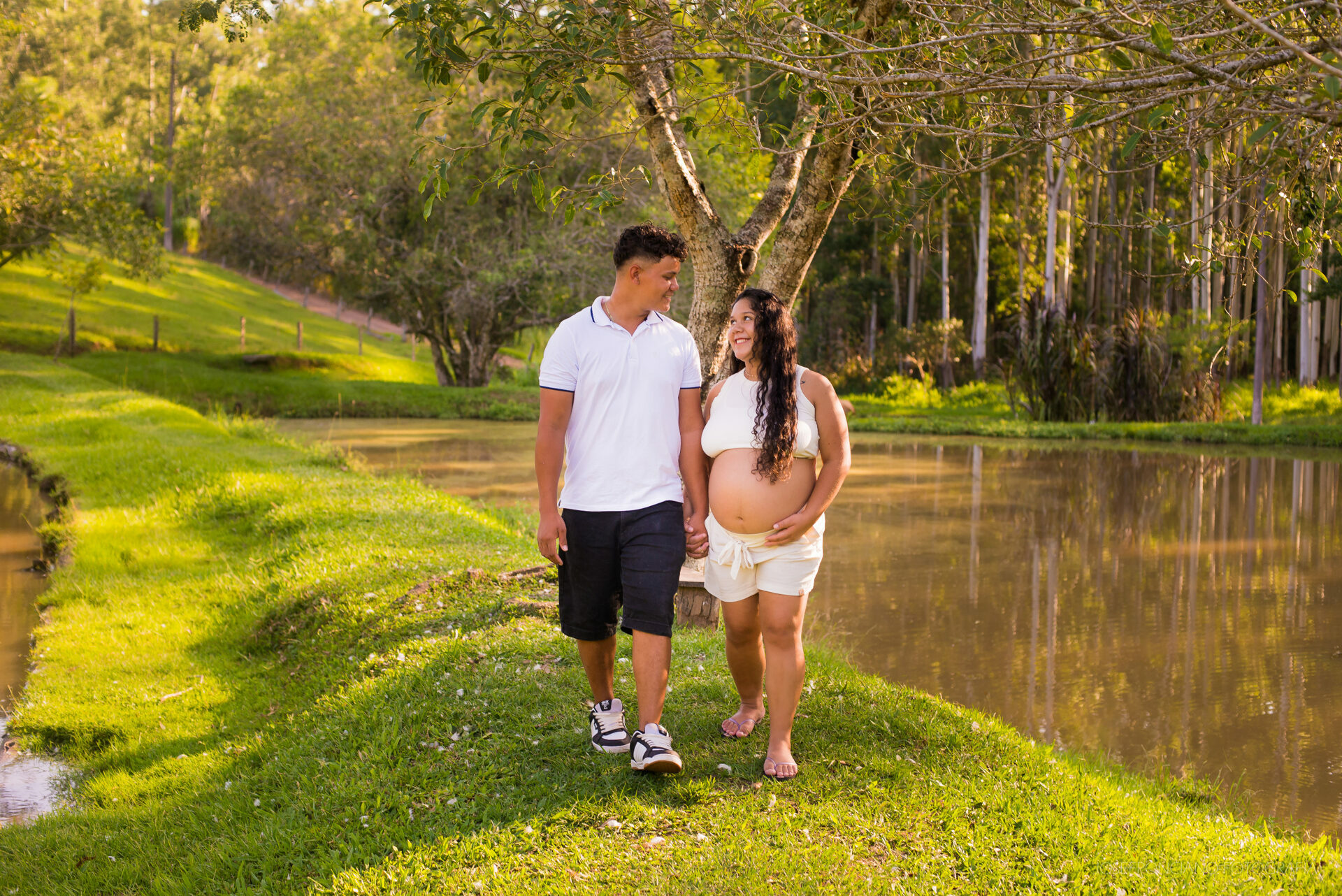 As fotos foram realizadas na Fazenda Wolff, em Rolante RS, um dos cenários mais lindos da região para quem busca um ensaio fotográfico ao ar livre com natureza, luz suave e um clima tranquilo. A manhã estava perfeita, com aquele ar de interior que deixa tudo mais leve e verdadeiro, ideal para um ensaio de gravidez cheio de conexão.