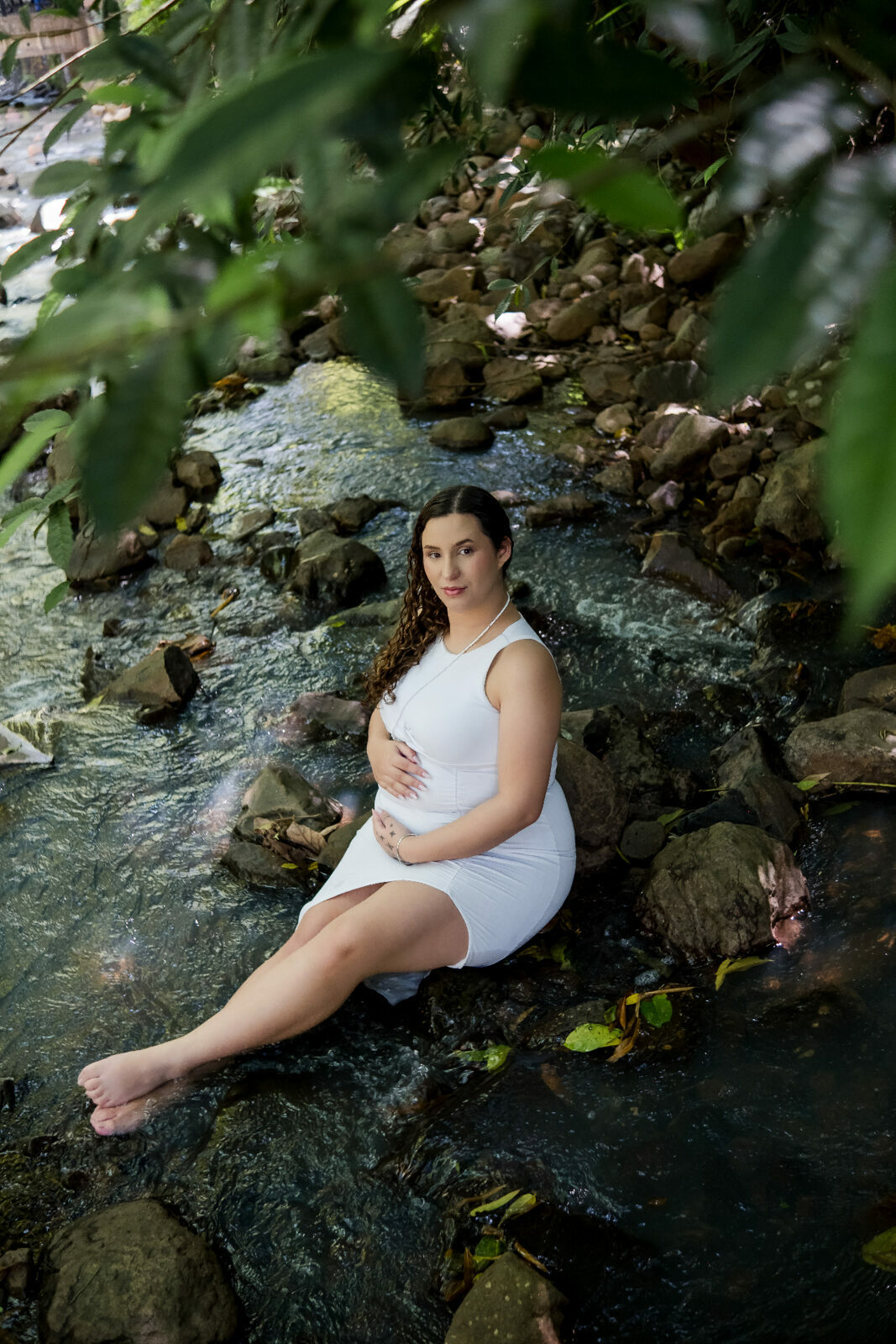 No Jardim Secreto, o rio e a sombra das árvores emprestaram o silêncio e o movimento ao ensaio de gestante ao ar livre. Ali, a gestante se deixou ficar por alguns minutos sentada na beira do rio, com a natureza abraçando a criança que vem chegando. As fotos de gestante ao ar livre mostram a mãe em diálogo com o vento e a água, imagens de um respirar profundo, de amor e de cuidado.