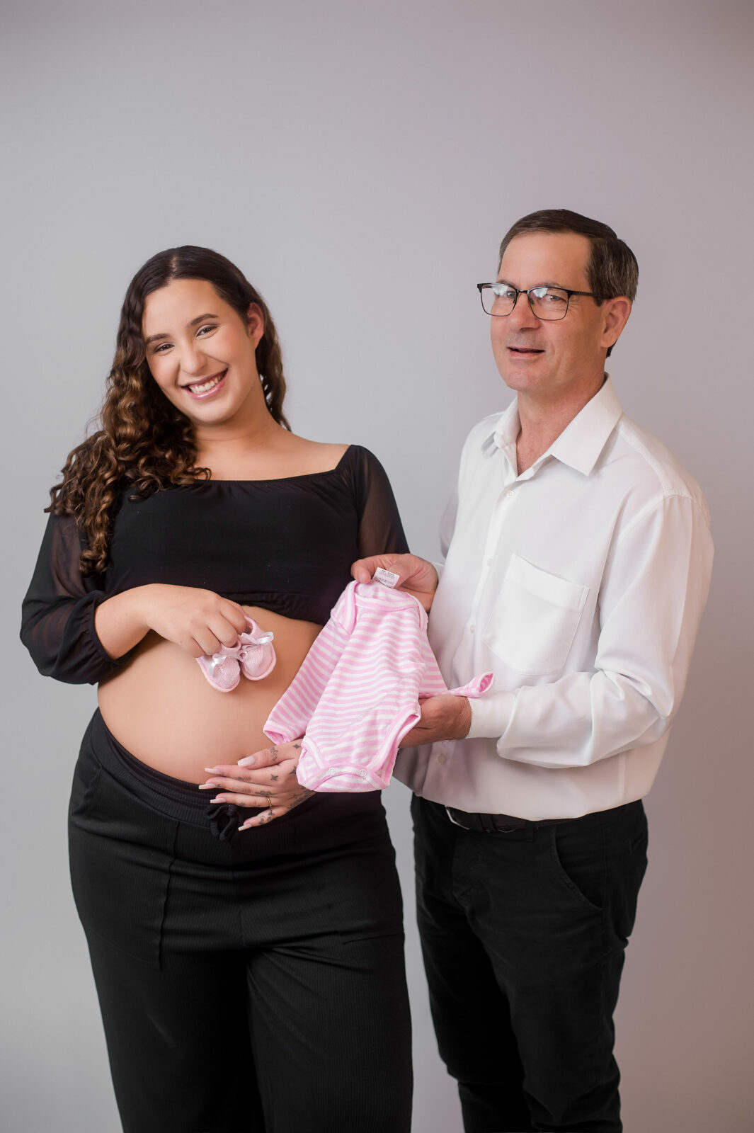 No ensaio de gestante juntamos dois mundos que conversam: o conforto do estúdio fotográfico e a calma do nosso Jardim Secreto. Dentro do estúdio, as imagens nasceram com uma luz suave, poses naturais e muitos gestos de afeto e carinho com a pequena Amélia. A presença dos pais de Emili, Angelita e Vanderlan (meus antigos professores do ensino médio), e da irmã Camili trouxe uma conexão verdadeira às fotos desta família que vem crescendo. Foi uma sequência de momentos que contam uma história antes mesmo da Amélia chegar.